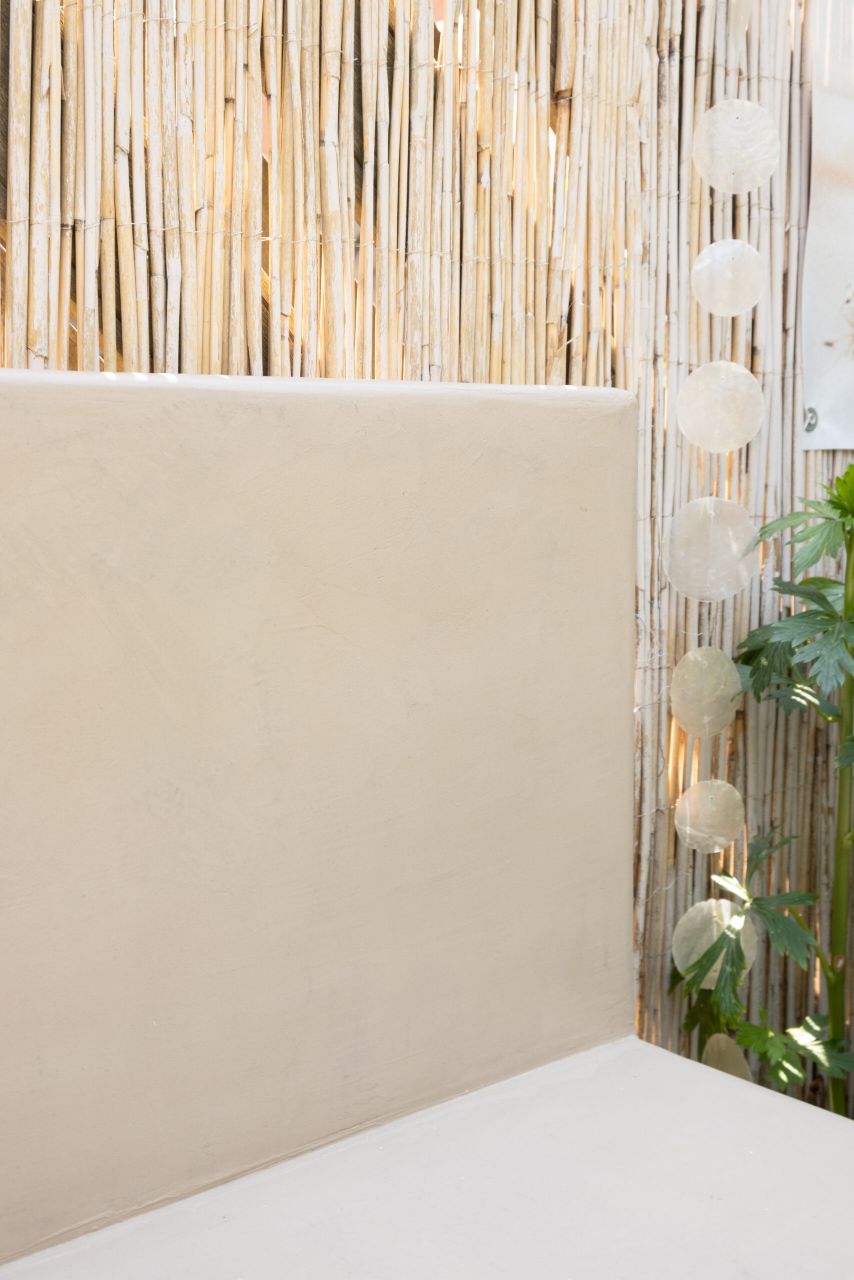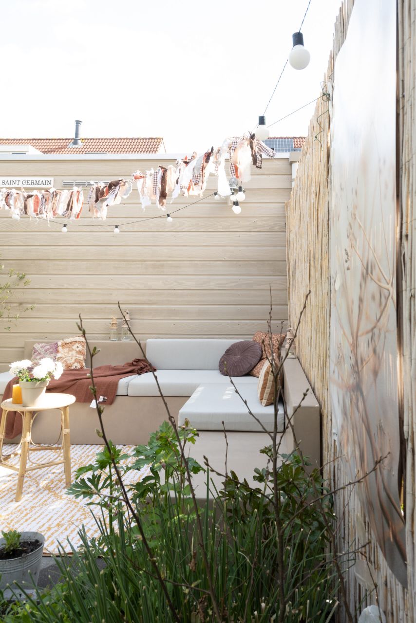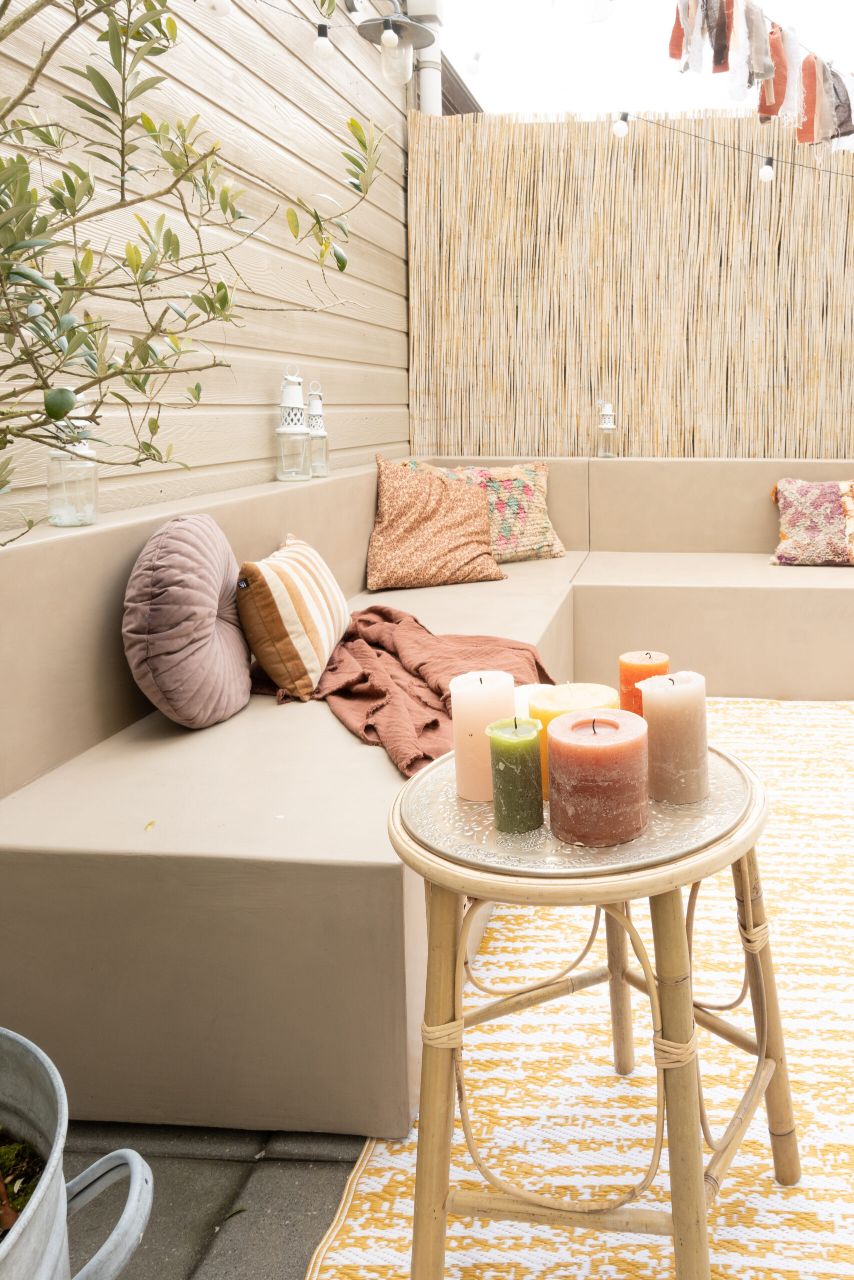 DIY tuinbank van Beton Cire Nederland, als ik ergens een instant vakantiegevoel van krijg is een vakantiegevoel in eigen tuin. Alle struiken en bloemen die bloeien, kleur en de zon. Je waant je dan echt ergens anders. Ergens in Marokko of op Ibiza. Het enige wat nog miste in onze tuin is een tuinbank in deze zelfde sfeer. Hoe mooi is het dan dat je dit zelf kunt maken. Een mooie hoekbank in een hele fijne naturel kleur die mooi blendt ook bij de kleur van de schutting en het bamboe.
