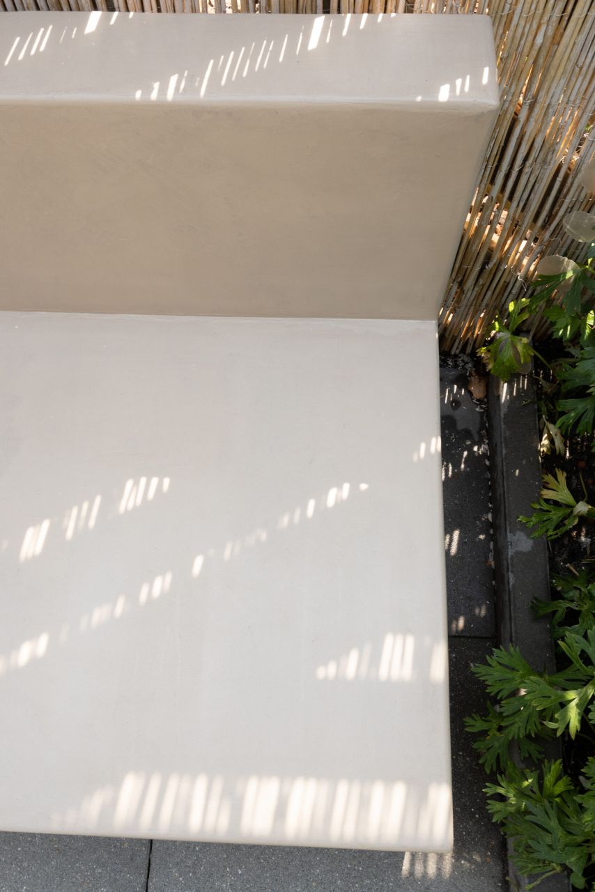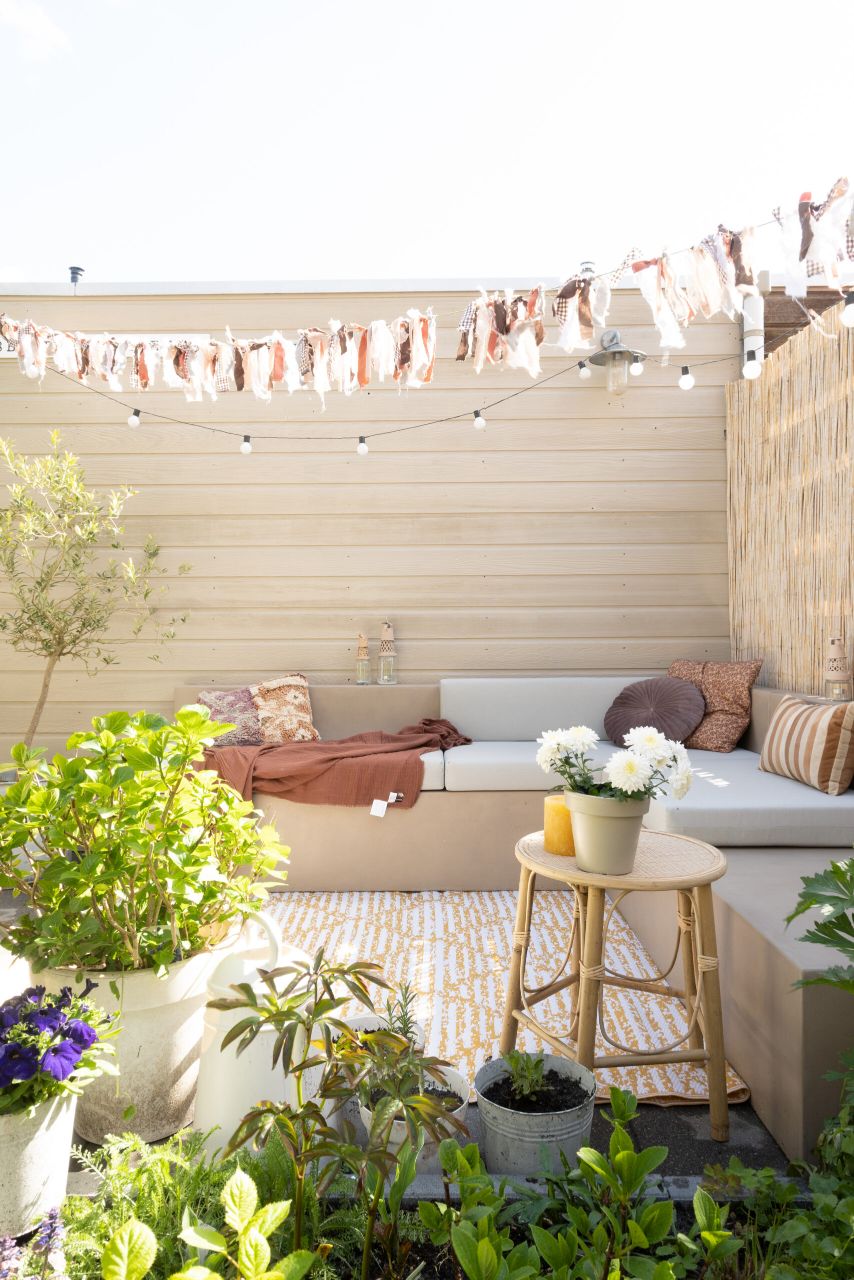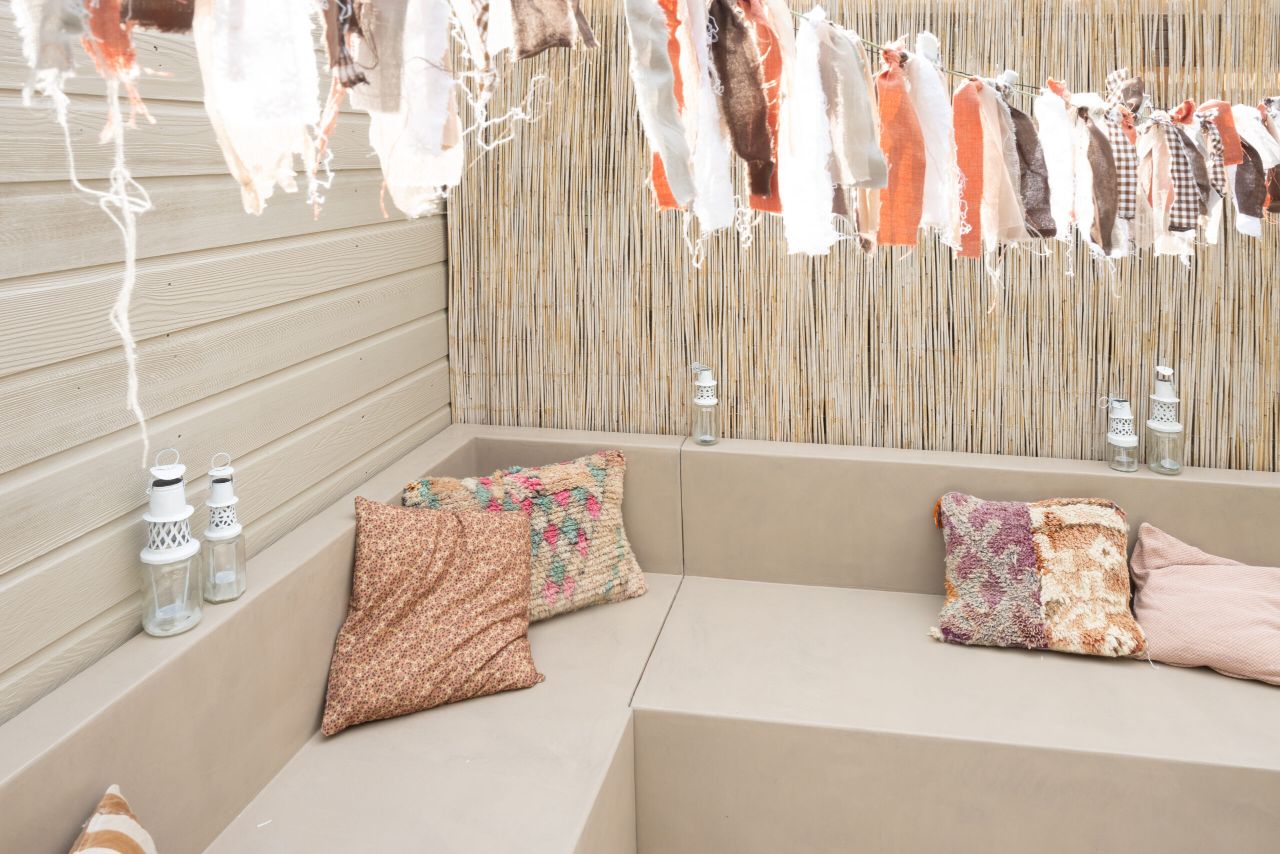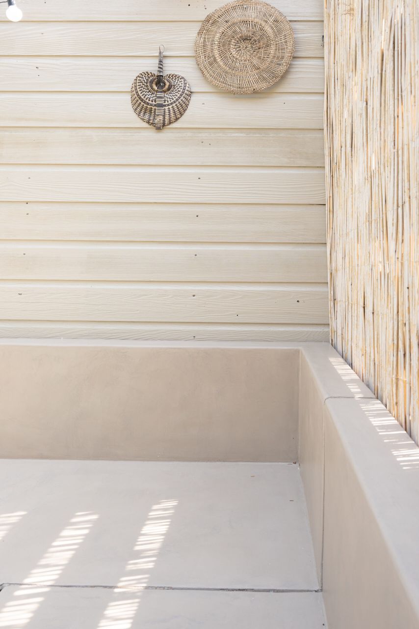 DIY tuinbank van Beton Cire Nederland, als ik ergens een instant vakantiegevoel van krijg is een vakantiegevoel in eigen tuin. Alle struiken en bloemen die bloeien, kleur en de zon. Je waant je dan echt ergens anders. Ergens in Marokko of op Ibiza. Het enige wat nog miste in onze tuin is een tuinbank in deze zelfde sfeer. Hoe mooi is het dan dat je dit zelf kunt maken. Een mooie hoekbank in een hele fijne naturel kleur die mooi blendt ook bij de kleur van de schutting en het bamboe.