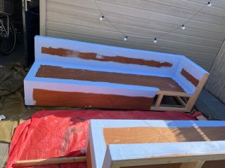 We zijn begonnen met de eerste laag. De kimband en de eerste laag zijn van de bouwmarkt. Zeker als je werkt met hoeken (zoals de hoeken in het zit en ruggedeelte) is dit aan te raden. Zo heb je minder kans op werking en scheuren.