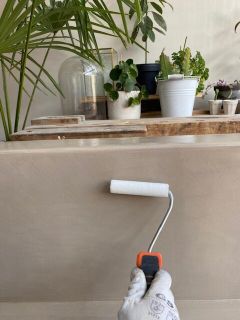 Daarna kun je beginnen met de beton ciré. Elke laag breng je aan met een spatel en laat je goed drogen. Na de lagen beton ciré begin je met de afwerkingslagen met een roller. Het is niet moeilijk. Je moet alleen wat geduld hebben omdat elke laag goed moeten drogen. Ga je buiten aan de slag, check ook goed de temperatuur en weersomstandigheden. Het is namelijk wel belangrijk dat de lagen goed kunnen drogen.