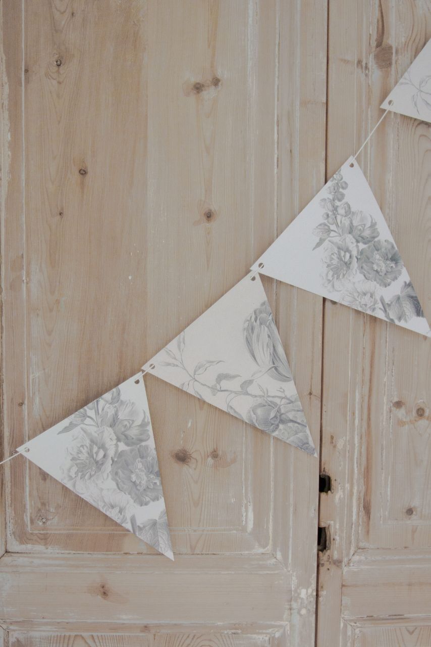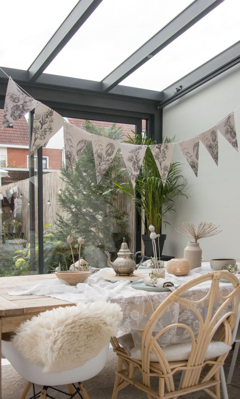 Nu we de tuinkamer hebben, hangen er ook steeds vaker vlaggetjes binnen. Leuk voor boven een gezellig gedekte tafel bij een BBQ, borrel of gewoon stamppot. Deze vlaggetjes heb ik zelf ontworpen via Fotofabriek. Je kunt dat een afbeelding naar keuze op de vlaggetjes laten afdrukken. Ik heb hier gekozen, en wellicht herkende je deze al, voor dezelfde print als de tuinposter buiten en poster in onze tuinkamer.