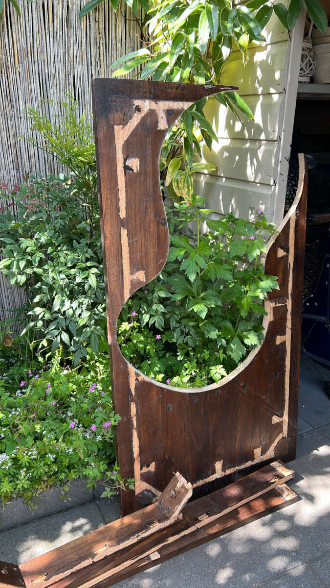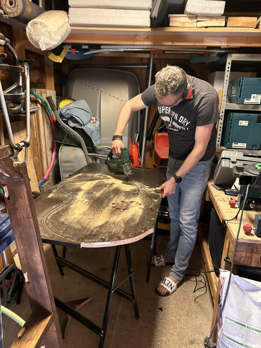 Vervolgens gekeken naar een tafel, gratis op te halen. Groot genoeg om de mal uit te kunnen zagen. Wel is het belangrijk om rekening te houden met het soort hout. Aangezien deze natuurlijk buiten komt te staan. Dus hardhout is dan echt heel erg fijn. We gaan deze tafel nog wel beitsen met dekkende houtbeits voor buiten, maar het hout houdt het gewoon langer als je goed hout hebt. Grenen is eigenlijk geen optie.