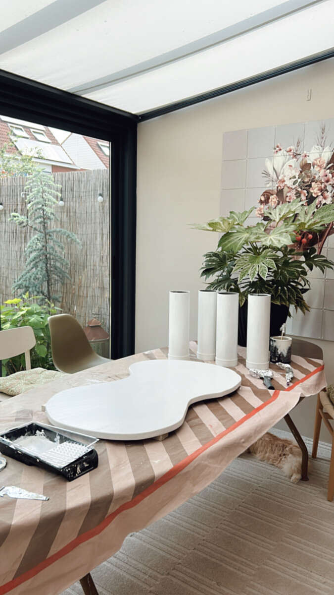 Je hebt voor de uiteinden van de regenpijp tafelpoten nog doppen nodig zodat deze makkelijk aan de tafel zijn te monteren. We hebben gekozen om deze vast te lijmen met montagekit. Ook geschikt voor buiten dus dit blijft dan ook echt goed zitten. We hebben de tafelpoten een beetje speels verdeeld onder de tafel. Zo krijgt het echt een hele unieke look. Bijna een design object. Echt zo ontzettend leuk om te doen.