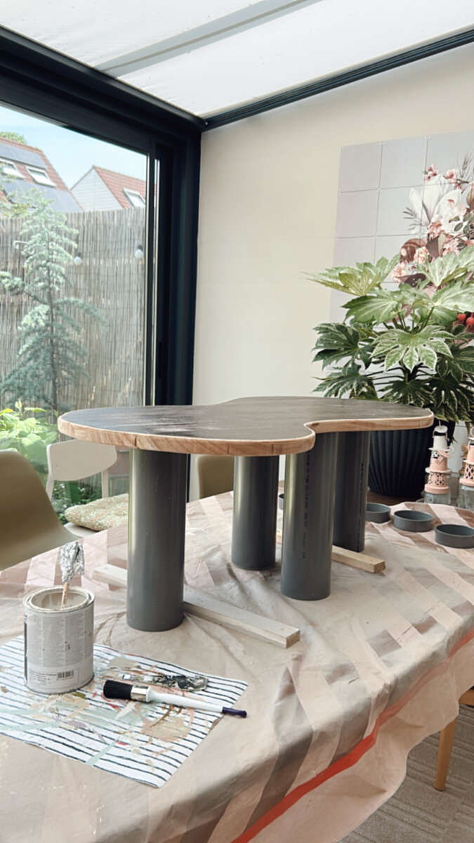 Totaal koste de tafel ongeveer 40,- euro (verf en regenpijp). Het tafelblad was gratis.