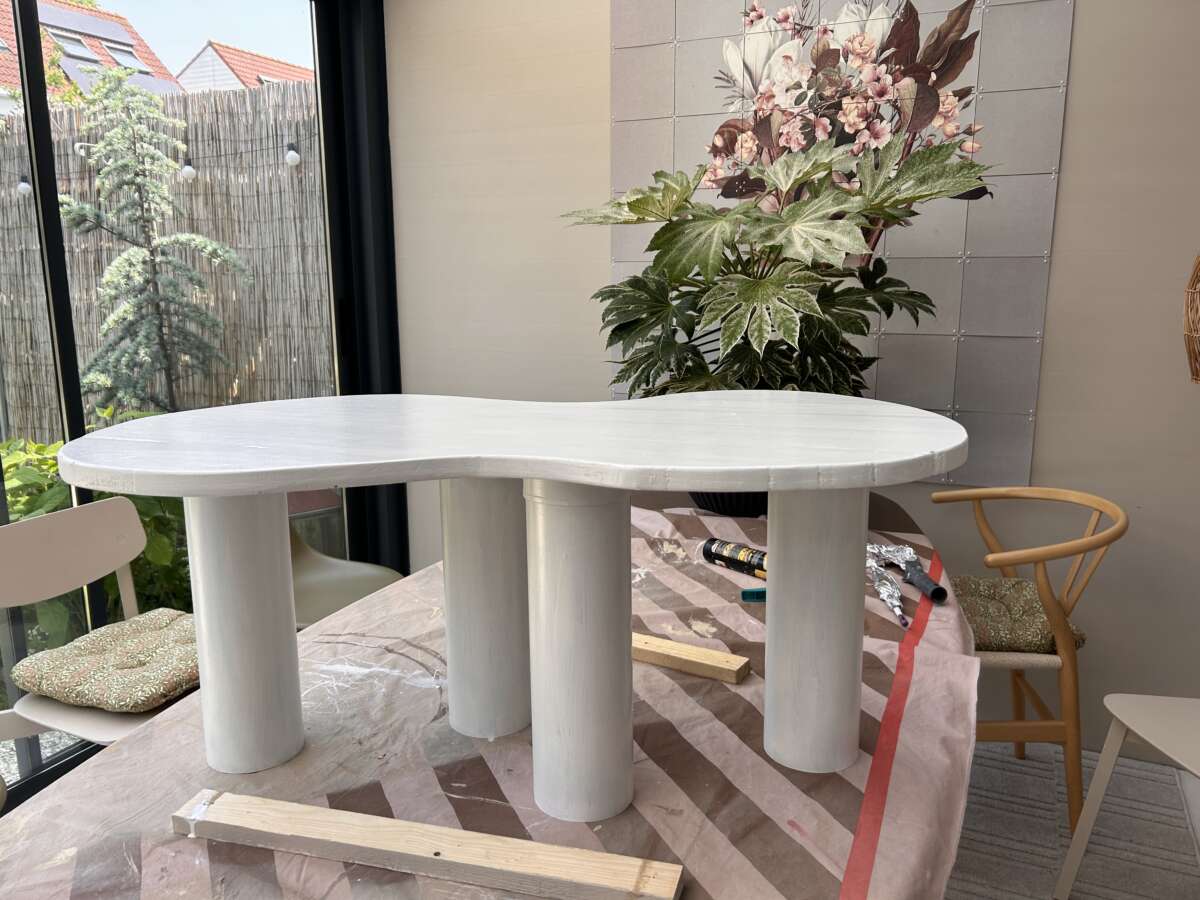 Vervolgens de gehele tafel inclusief de poten geschilderd in een witte dekkende houtbeits voor buiten. Ik heb hiervan drie lagen toegepast. Advies is om wel eerste goed te schuren en de tafel én poten in de grondverf te zetten. Zo hecht de beits nog beter en heb je hier gewoon langer plezier van.