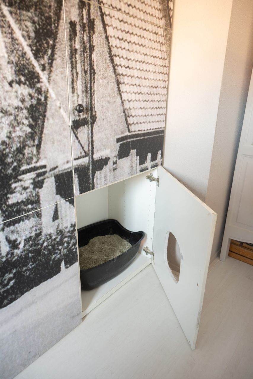 Ik deel mijn werkkamer met de katten, dus er moest ook nog een plek voor de kattenbak komen. Heel handig. Het deurtje kan open, dus makkelijk schoonmaken. En zij kunnen middels de opening makkelijk de bak in. Vaak zijn kattenbakken niet heel erg interieurproof dus ideaal om dit lelijke ding zo weg te werken.