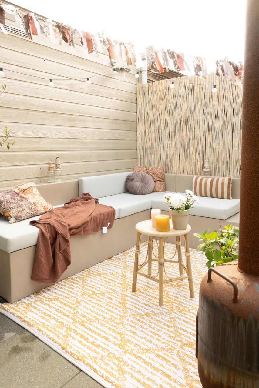 DIY tuinbank van Beton Cire Nederland, als ik ergens een instant vakantiegevoel van krijg is een vakantiegevoel in eigen tuin. Alle struiken en bloemen die bloeien, kleur en de zon. Je waant je dan echt ergens anders. Ergens in Marokko of op Ibiza. Het enige wat nog miste in onze tuin is een tuinbank in deze zelfde sfeer. Hoe mooi is het dan dat je dit zelf kunt maken. Een mooie hoekbank in een hele fijne naturel kleur die mooi blendt ook bij de kleur van de schutting en het bamboe.