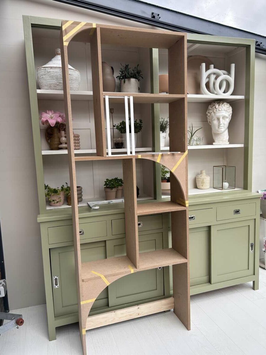Vervolgens hebben we de rondingen en de latjes in de kast toegevoegd. De latjes vond ik leuk om net weer iets anders toe te voegen aan de kast. En als je er in de avond een kaarsje achter zet, geeft dit een waanzinnig leuk effect. En ook weer een trendy item, latjes zijn de laatste tijd niet meer weg te denken uit een interieur.