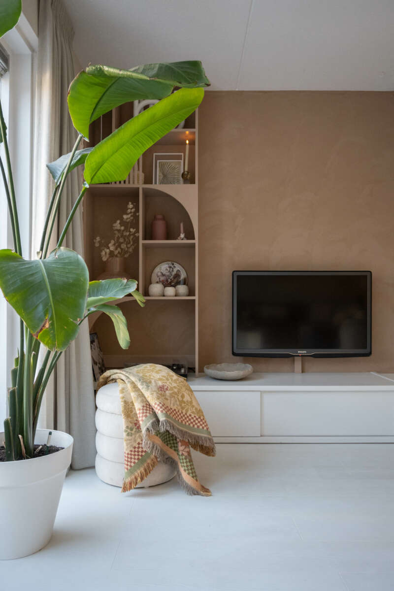 De kast heb ik geschilderd in de kleur Berlin Summer van Labpaint. Een mooie warme kleur. Om de kast mooi te laten weg vallen in de muur en daardoor minder fors te laten lijken hebben we de muur ook in dezelfde kleur geschilderd. Dit geeft een mooi en warm geheel. De tv valt ook wat meer weg. En daar ben ik ontzettend blij mee :). Ook de platenspeler past precies onder het laatste vak.