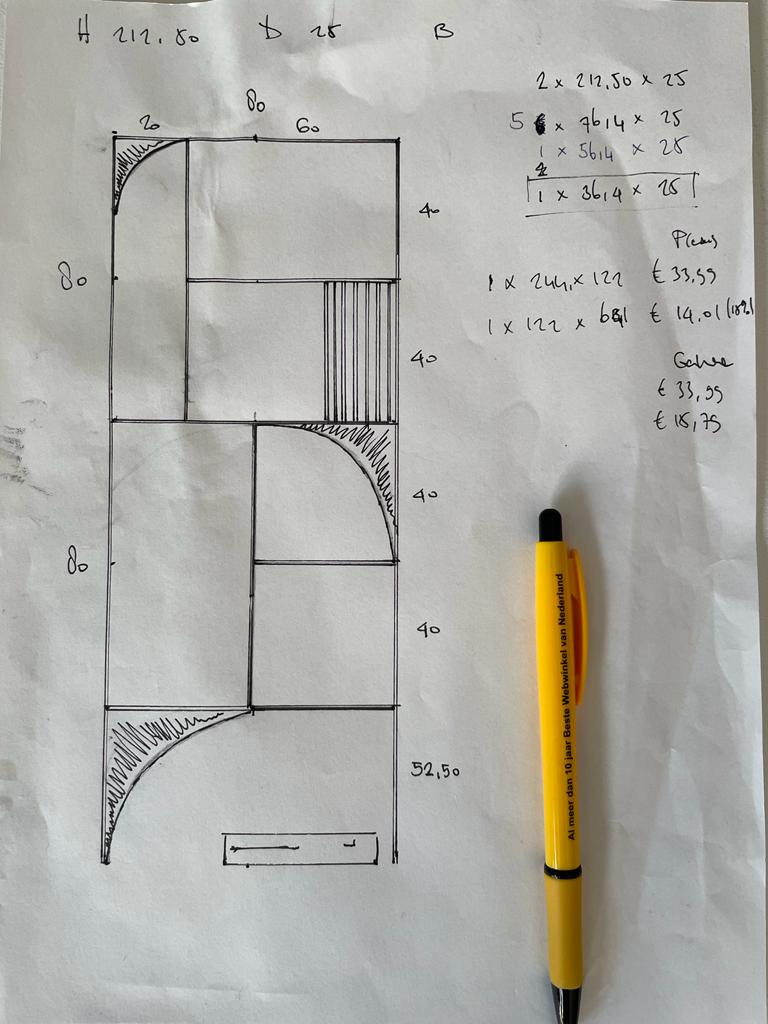 Dus gingen we aan de slag. Ik had inspiratie op gedaan op Pinterest en Instagram. Heel veel soorten kasten zijn de revue gepasseerd. En vervolgens zijn we gaan tekenen. Ik vind zelf de rondingen die je steeds meer ziet in kasten en meubels heel erg mooi. Dus dat moest er zeker in komen. Dit geeft namelijk in zo’n hoek met veel hoeken en rechte kanten net even wat meer zachtheid en balans.