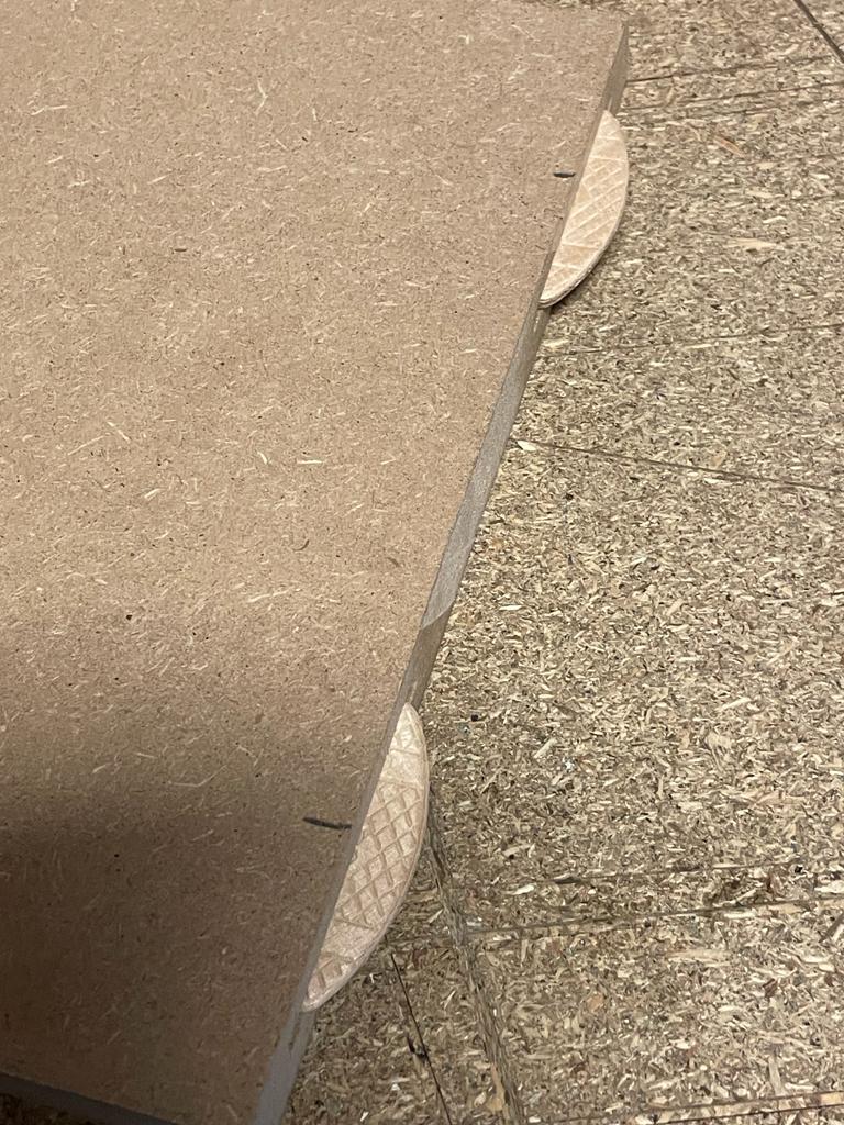 We hebben gewerkt met een houtverbinding in de zijkanten van de planken zodat er geen schroeven nodig zijn. En daardoor makkelijker om de ongelijke vakken in het nieuwe wandmeubel te maken.