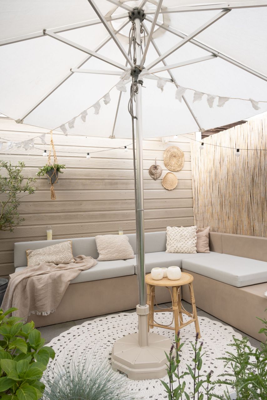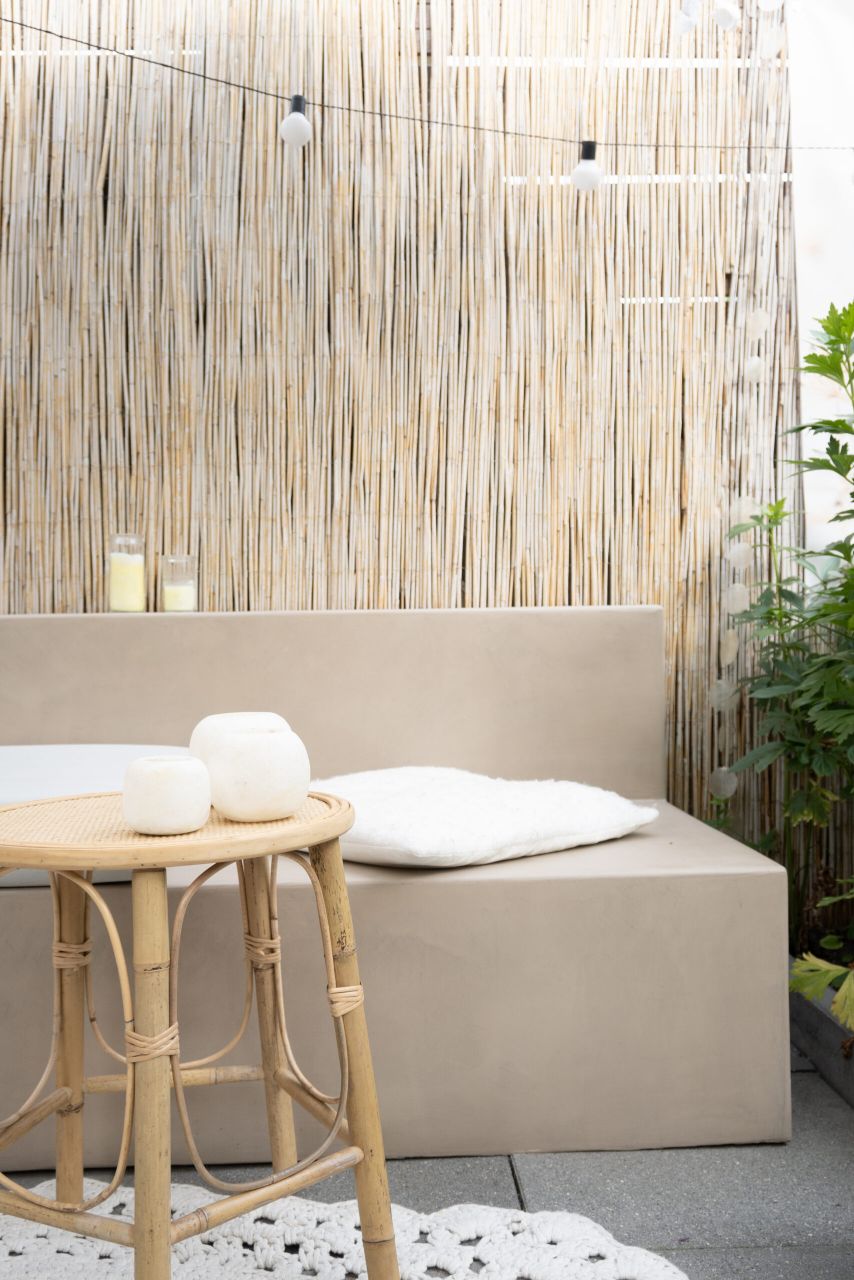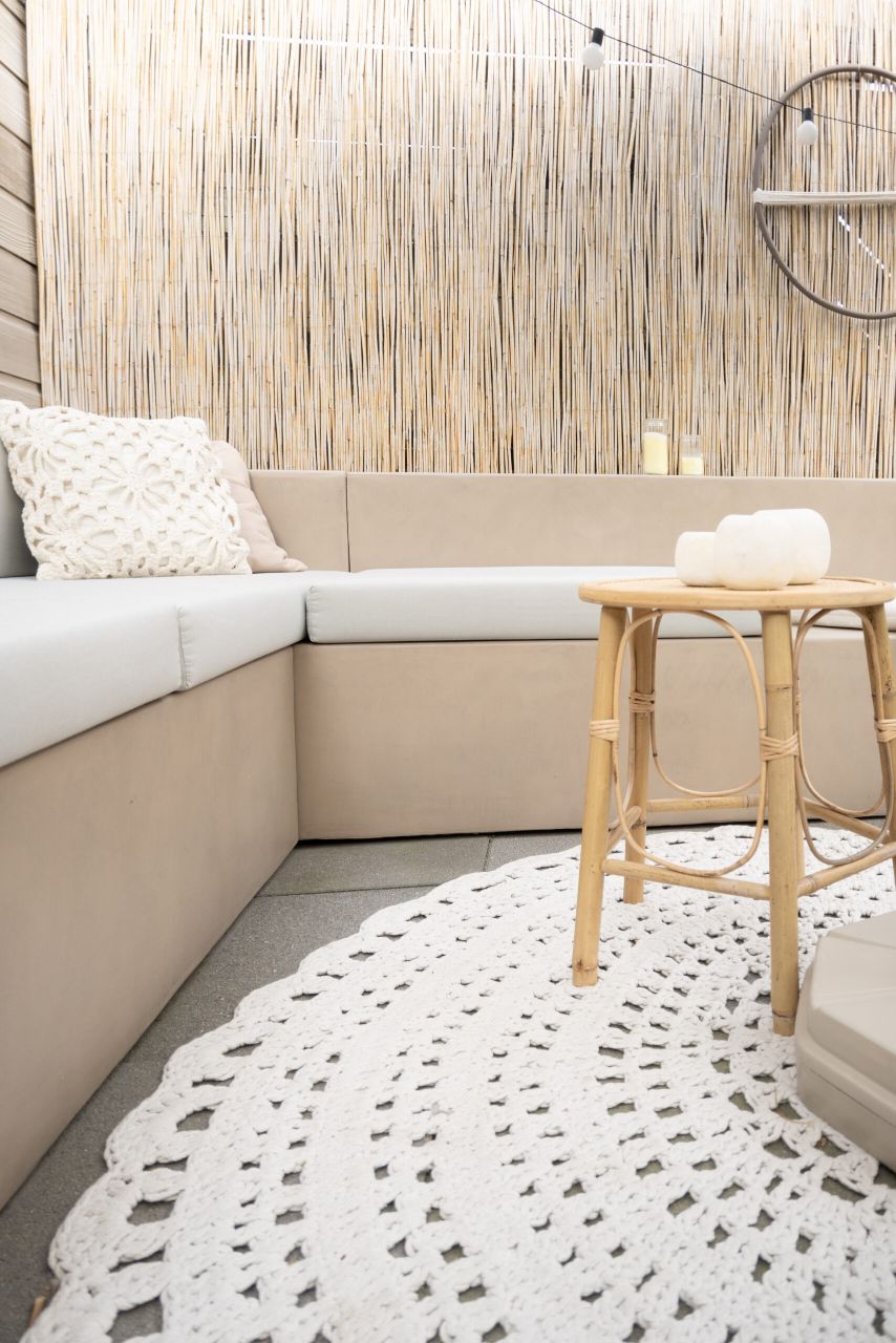Door voor een rustige basis te kiezen in naturel kleuren kun je alle kanten op. De rustige basis zit hem in de kleur van de schuur, kleur van de op maat gemaakte kussens en de bamboe.