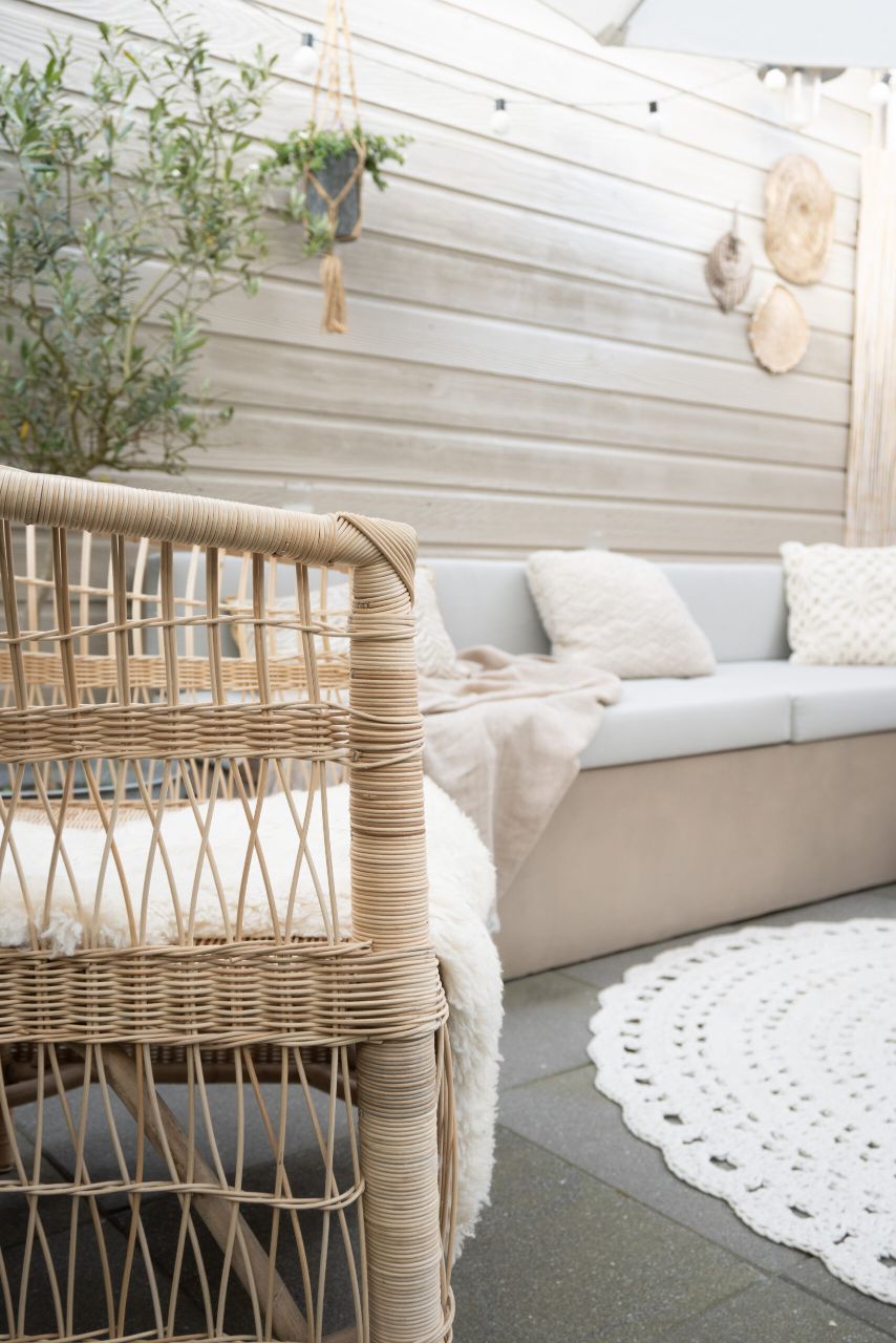 Het naturel van de betoncire met tinten wit, offwhite en beige. Het kleed heb ik van binnen naar buiten gehaald. Als het mooi weer is, kan dit makkelijk.