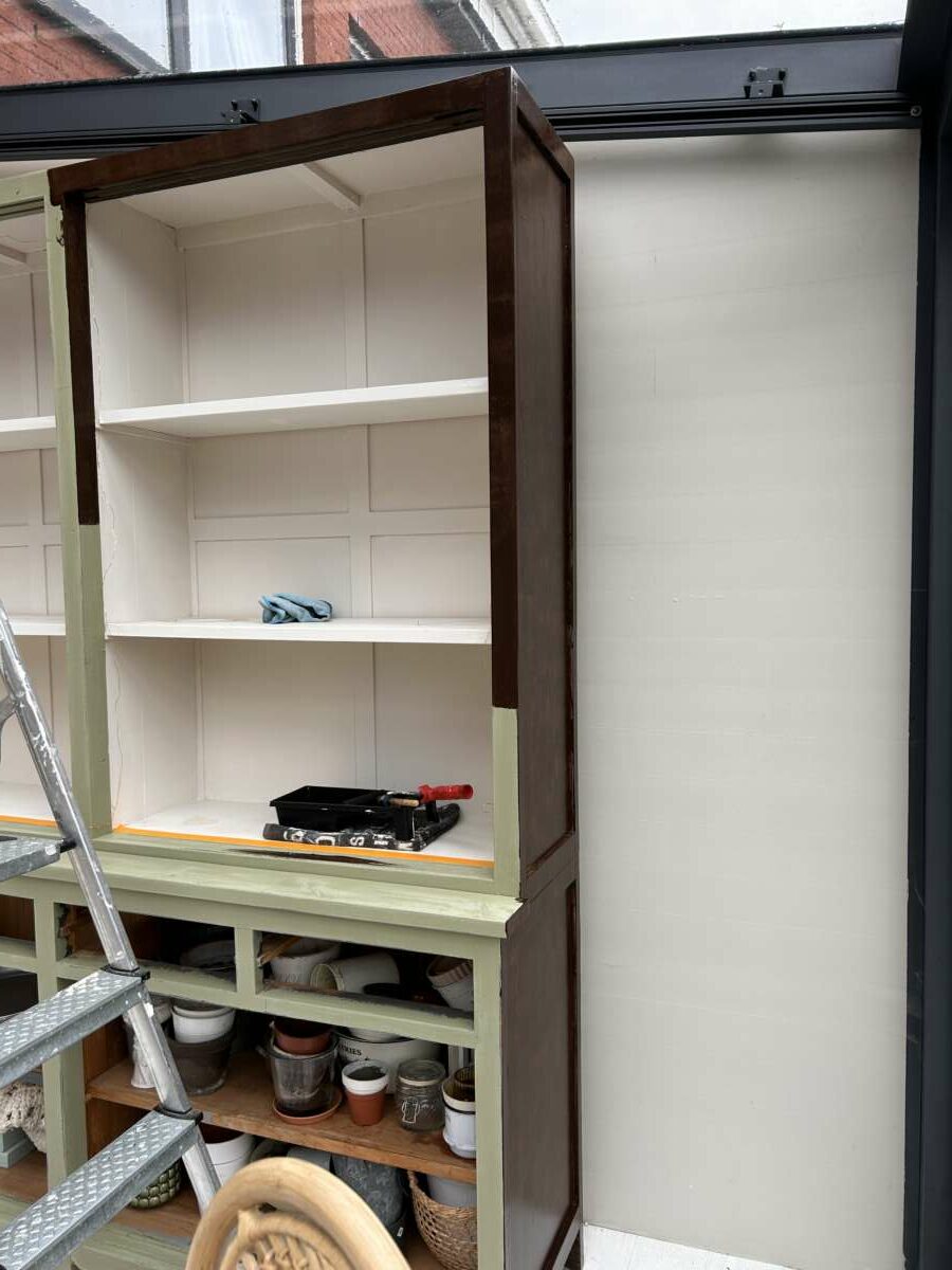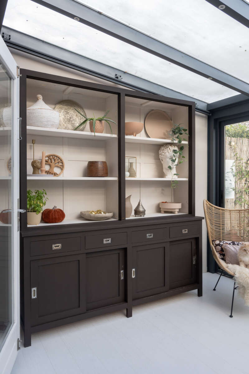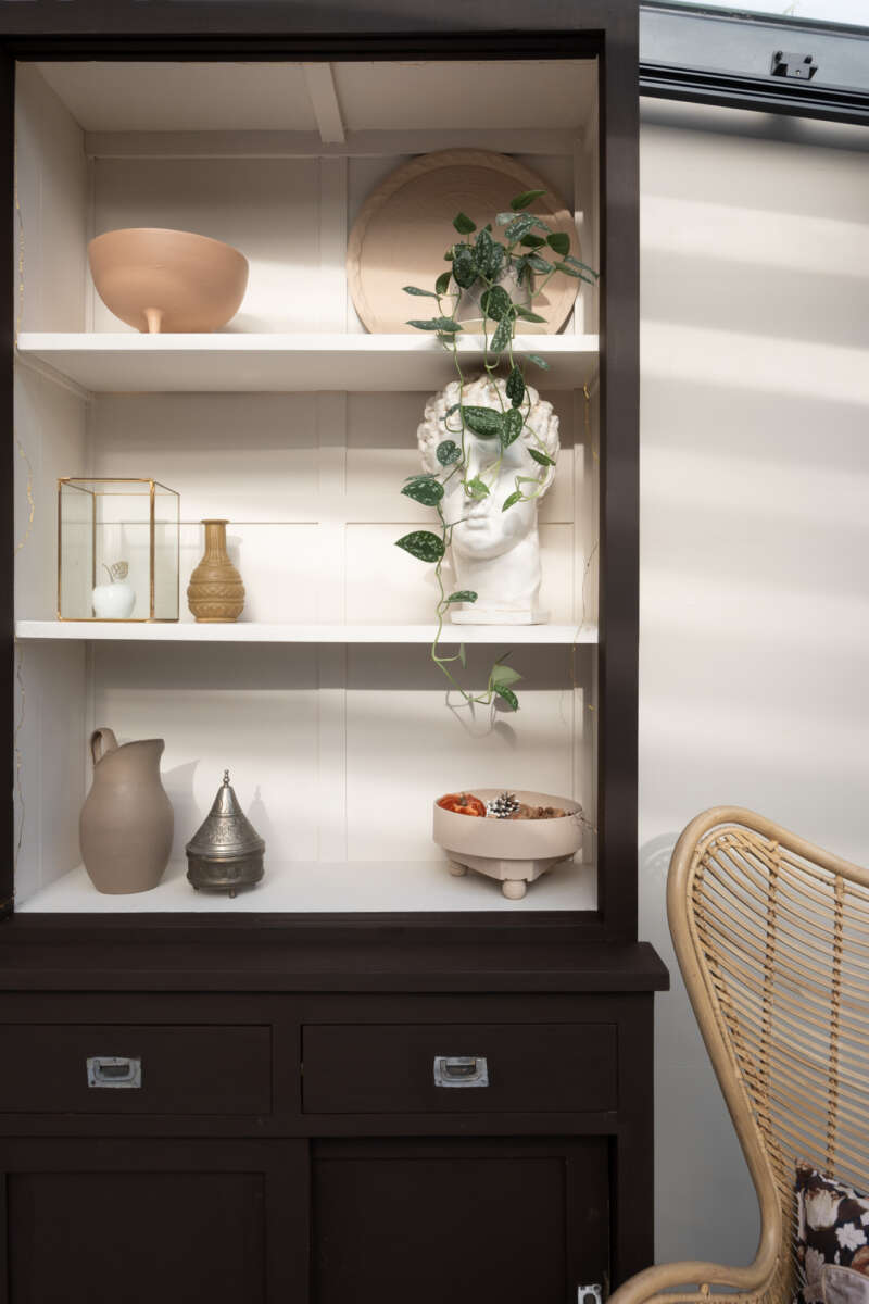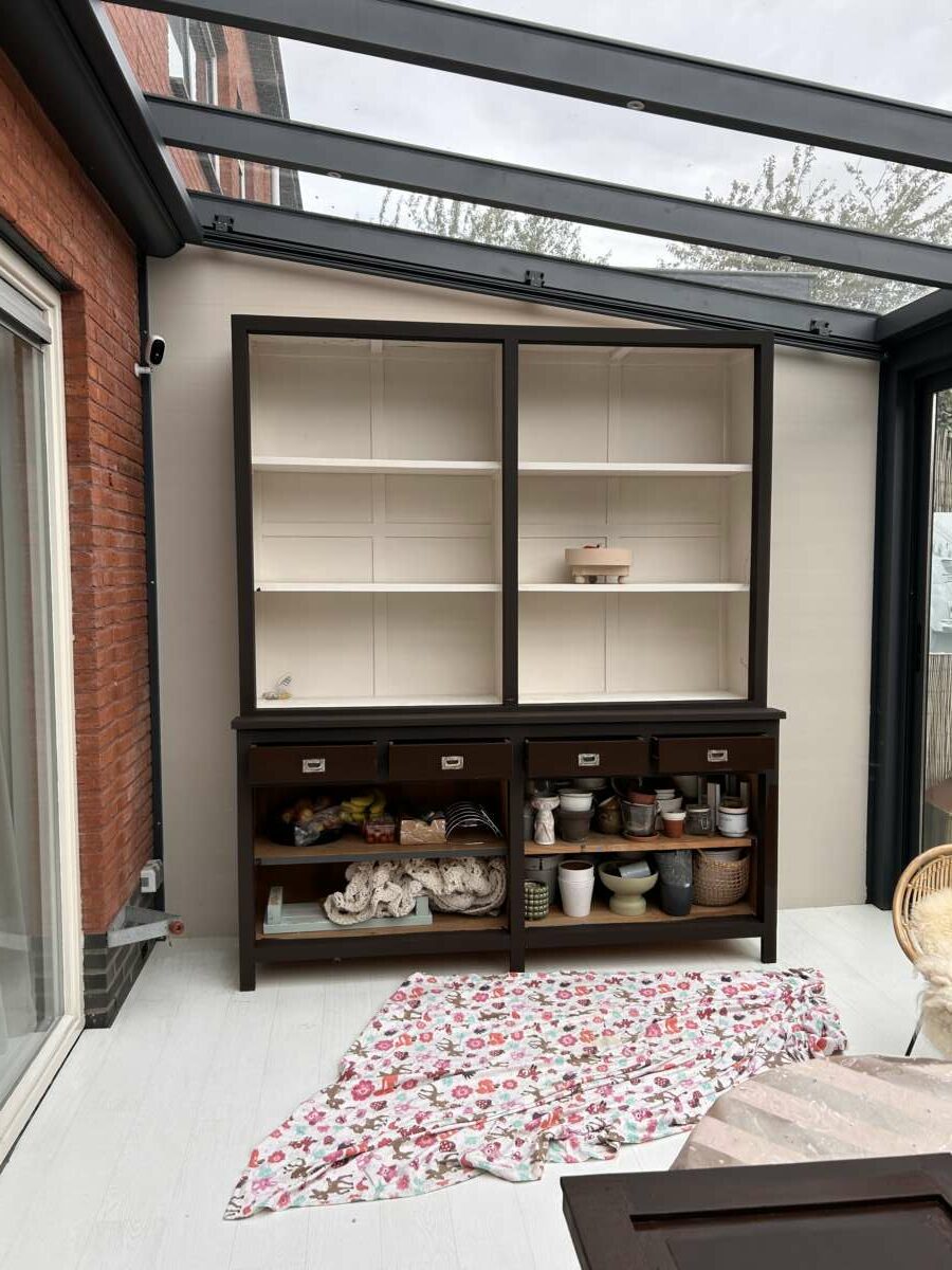 Het was best wel een werkje maar dit is het eindresultaat. Ik ben er zo blij mee. Ook van binnen uit naar buiten kijkend is het een warme toevoeging aan de ruimte. Ik heb de binnenkant van de kast licht gelaten. Ik vind het contrast met de bruine warme kleur nog mooier. Het heeft wat meer pit. Ik kan niet wachten om straks met de kerstperiode hier allemaal leuke items aan toe te voegen.