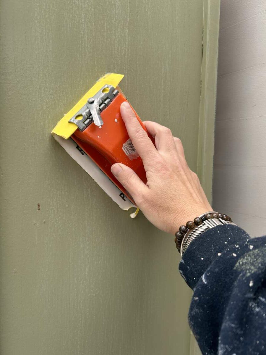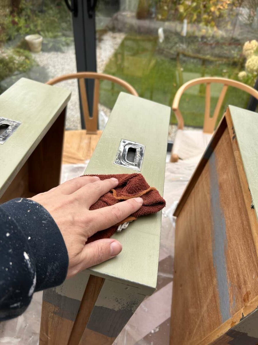 Hoe ben ik begonnen? Allereerst de kast goed ontvet en schoongemaakt. De verf die er op zit, zat er nog goed op. Dus alleen schuren is dan belangrijk. Er mag flink geschuurd worden, korrel 80 heb ik gebruikt voor deze kast. Dat betekent dat de verf beter hecht en dat is wel zo fijn voor een mooi eindresultaat.
