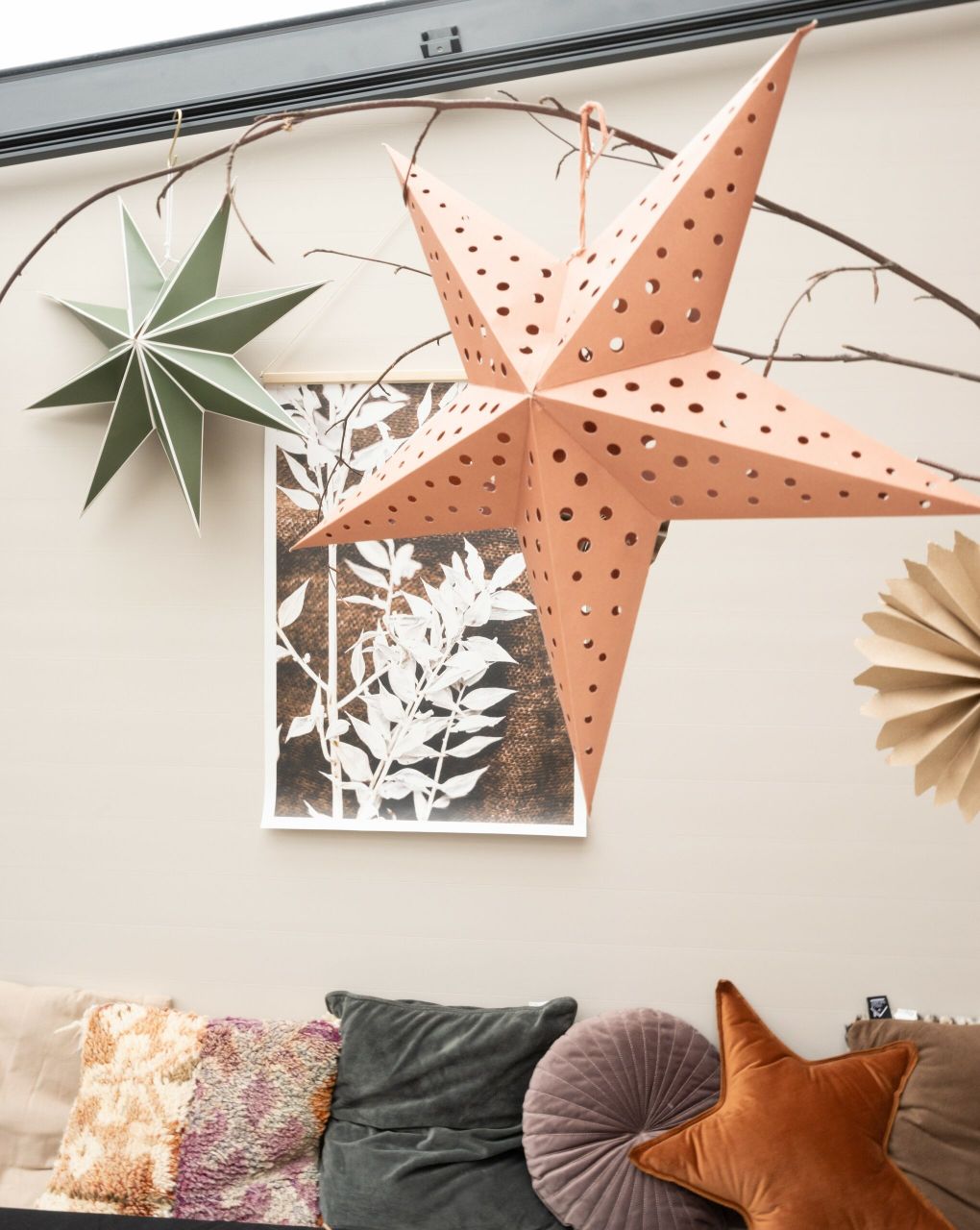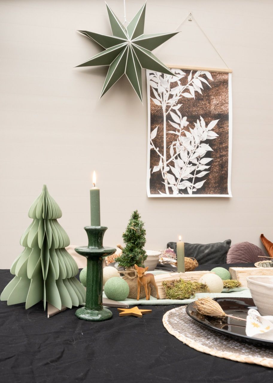 De papieren slingers, zowel een DIY van pakpapier als de kant en klare papieren slingers. En de papieren kerstbomen.