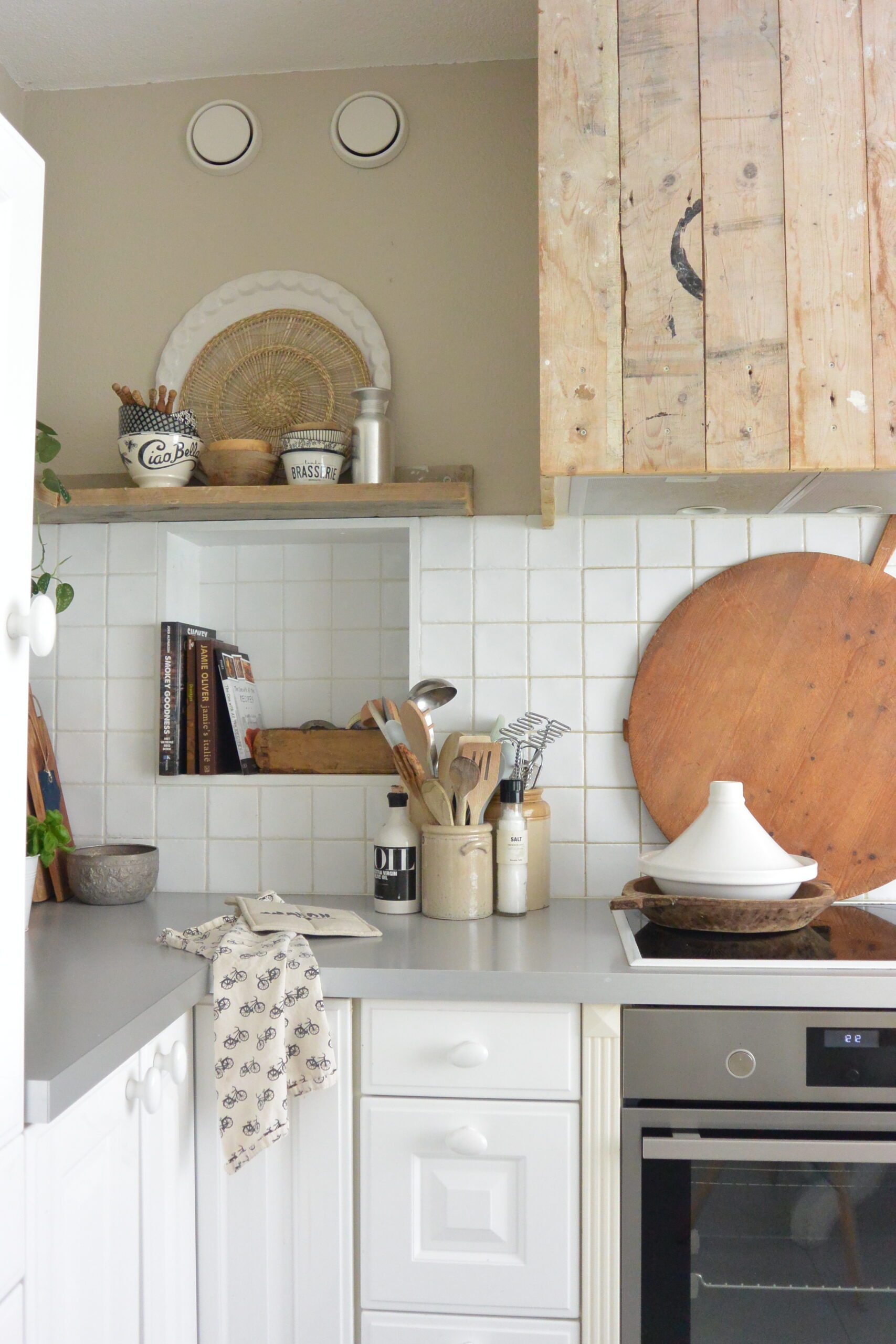 In combinatie met wit en hout krijg je een knus en gezellig geheel. Zelf adviseer ik de keuken rustig te houden omdat er al veel staat en gebeurt. Je kunt het met accessoires heel gezellig maken. Heb je de blog al gelezen van de make over van de keuken?