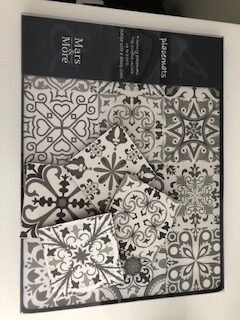 Een aantal maanden kocht ik placemats met een oosterse print in het grijs. Het lijken net tegeltjes. Geweldig zijn deze. Maar de tegels (geen echte maar op kurk geprint) moesten nog wel op maat worden gezaagd. De placemat was gewoon erg lastig op maat van de tegeltjespatroon te zagen. Toch zijn ze nog steeds erg leuk en ze staan ook super leuk. Misschien gebruik ik deze wel weer ergens anders voor, #nowaste.
