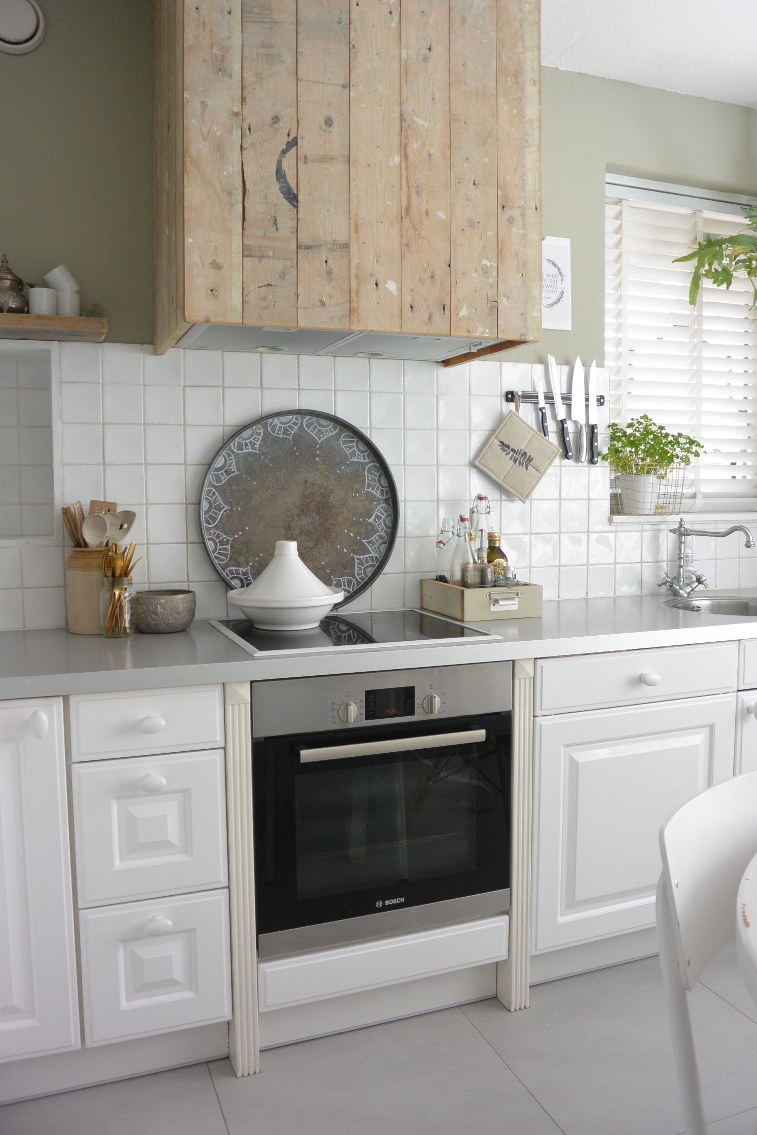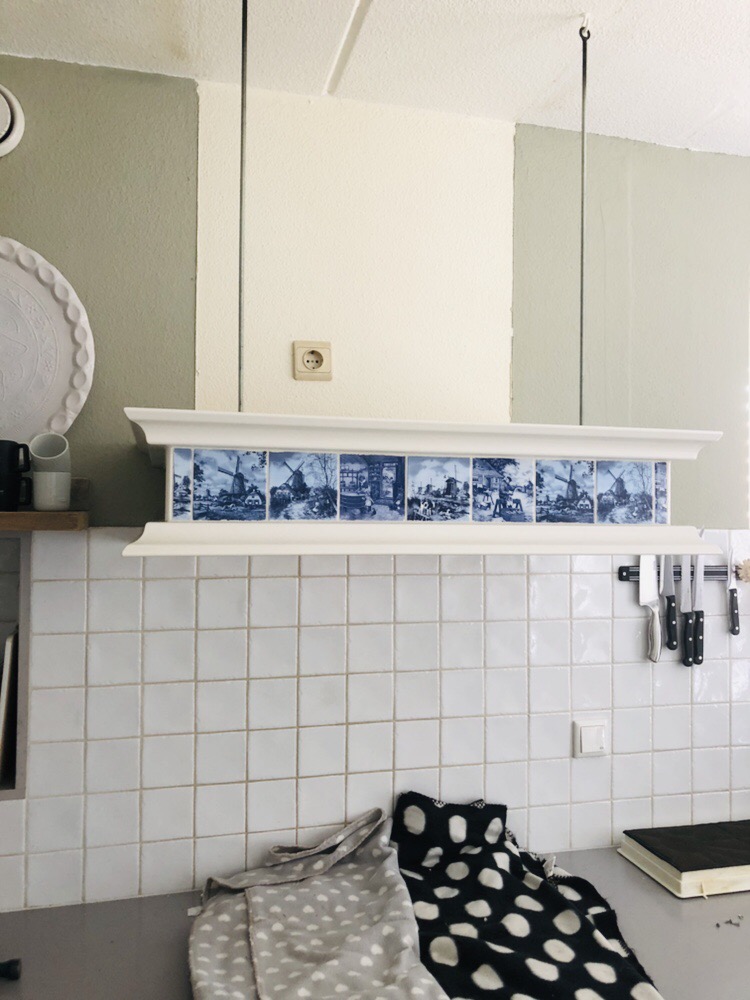 Zelf ben ik al een tijdje aan het nadenken over de schouw/afzuigkap. Deze is nog erg landelijk met Delfts blauwe tegeltjes. Ik heb overwogen dit misschien met plakplastic of behang erover heen te plakken. Maar ik kon eigenlijk nooit de maat vinden. De tegeltjes waren 10×10.