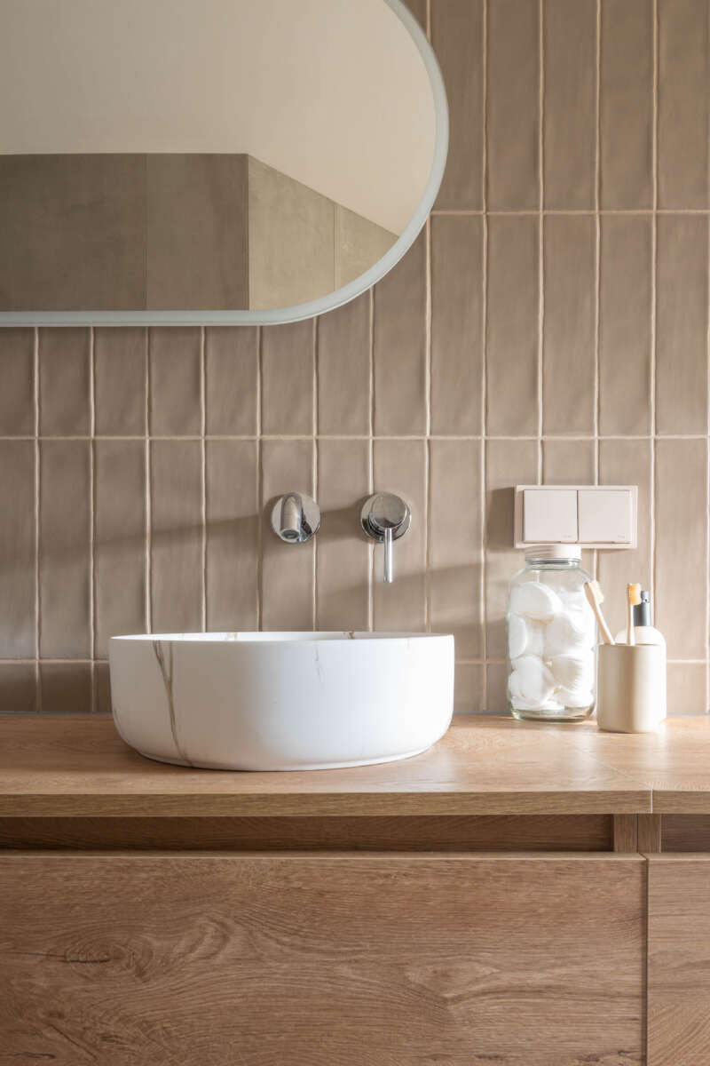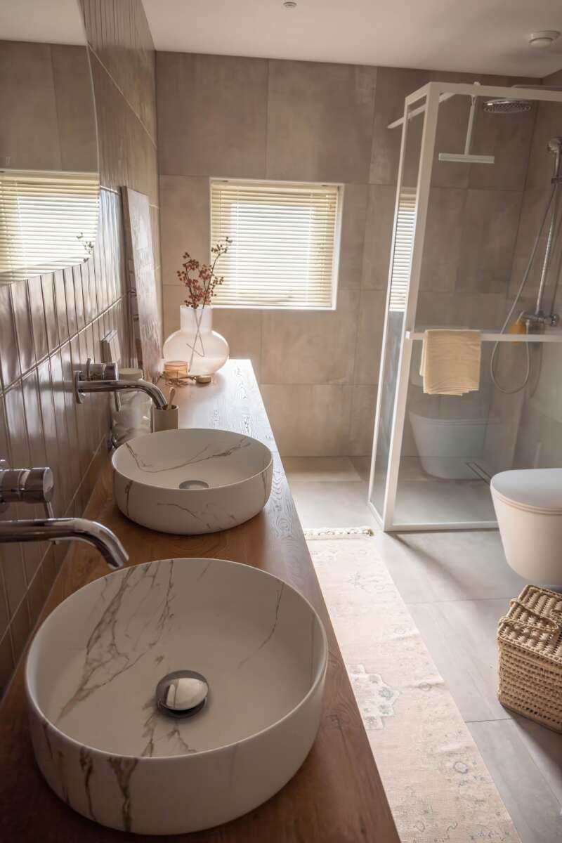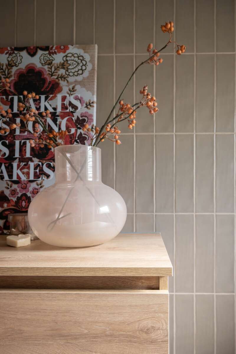 De bewoners wilden zeker geen wit maar meer warme tinten. We hebben gekozen voor een fijne basis met wit sanitair en grote grijs beige tegels voor het grootste deel van de badkamer.
