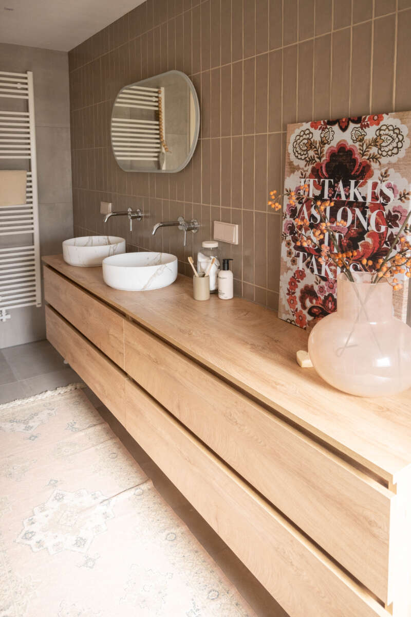 De bewoners gingen aan de slag met de verbouwing van de badkamer. Dat mocht ook wel na meer dan 25 jaar. De wensen waren een ruimtelijk gevoel, warmte en sfeer, praktisch en tijdloos. Hoe voeg je al deze wensen samen? Maar maak je het niet te saai.
