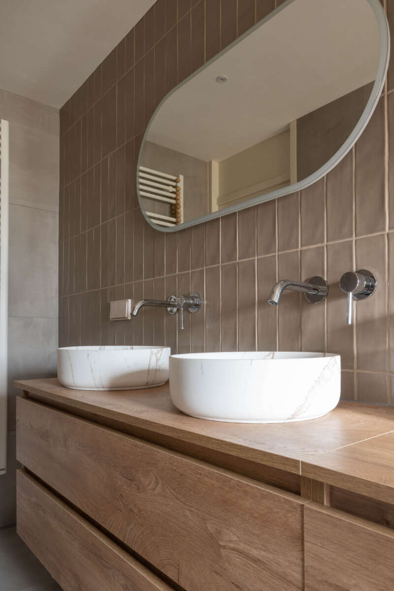 Daarnaast om niet al te saai te laten ogen, hebben we gekozen om de andere wand achter het badkamermeubel te werken met rechthoekige tegels in een fijne bruine kleur. Ook de wastafels hebben een marmertekening.