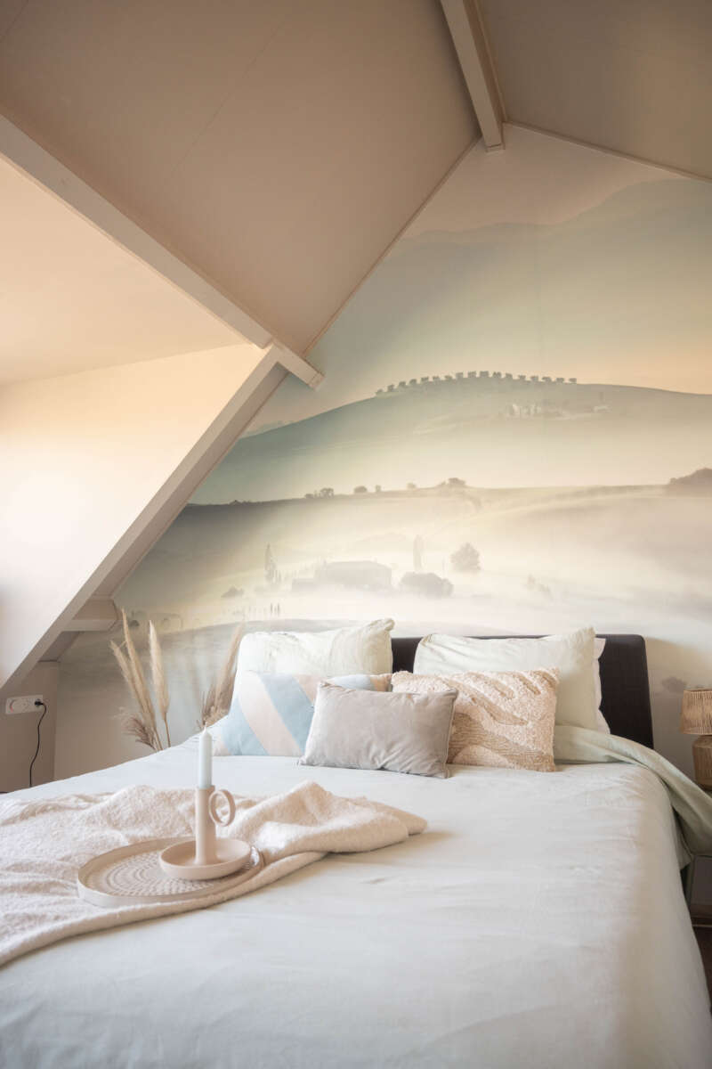 Ik heb een prachtig fotobehang gevonden en ben hierop verder gaan borduren. De kleuren uit het behang heb ik meegenomen in de rest van de ruimte. Alle andere muren, balken en plafond zijn in dezelfde kleur geschilderd voor een rustig effect en balans in de ruimte.