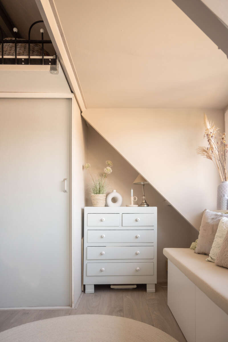 Voor een tussenwoning in Almere mocht ik aan de slag met een compleet interieurontwerp voor de zolderkamer. De bewoners wilden graag meer ruimte en eenheid op de slaapkamer op de zolderverdieping. De bewoners hebben een dakkapel op het dak laten zetten om zo meer ruimte en licht te creëren in de slaapkamer. Ook wilde ze graag meer lichte kleuren, rust en eenheid in deze ruimte. Daarnaast wilden de bewoners graag advies over de vloer, meubels en accessoires.