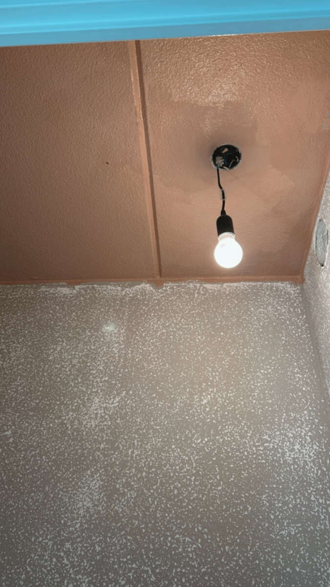 Het plafond wilde ik ook iets tofs mee doen. Hier heb ik gekozen voor een van de kleuren uit het behang. Dit is een muurverf van Graham & Brown. Heel fijn ook, dekt goed. En zeker op zo’n grof gestuct plafond is dat wel heel erg fijn. Wat zo fijn is aan het behang van Graham & Brown. Op de website wordt gelijk aangegeven welke kleuren bijpassend zijn. Dan heb je gelijk de juiste kleuren te pakken. Wel zo fijn.