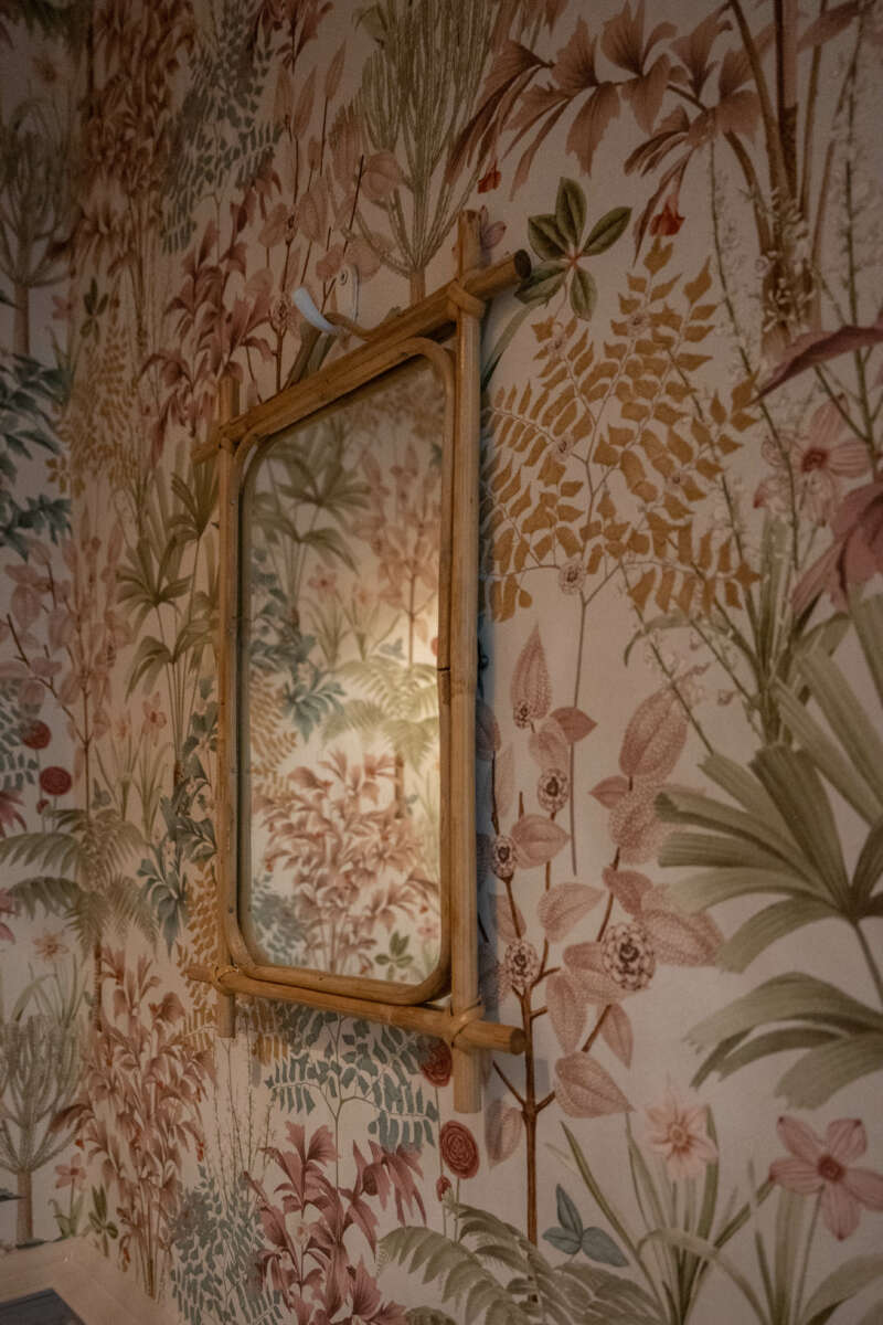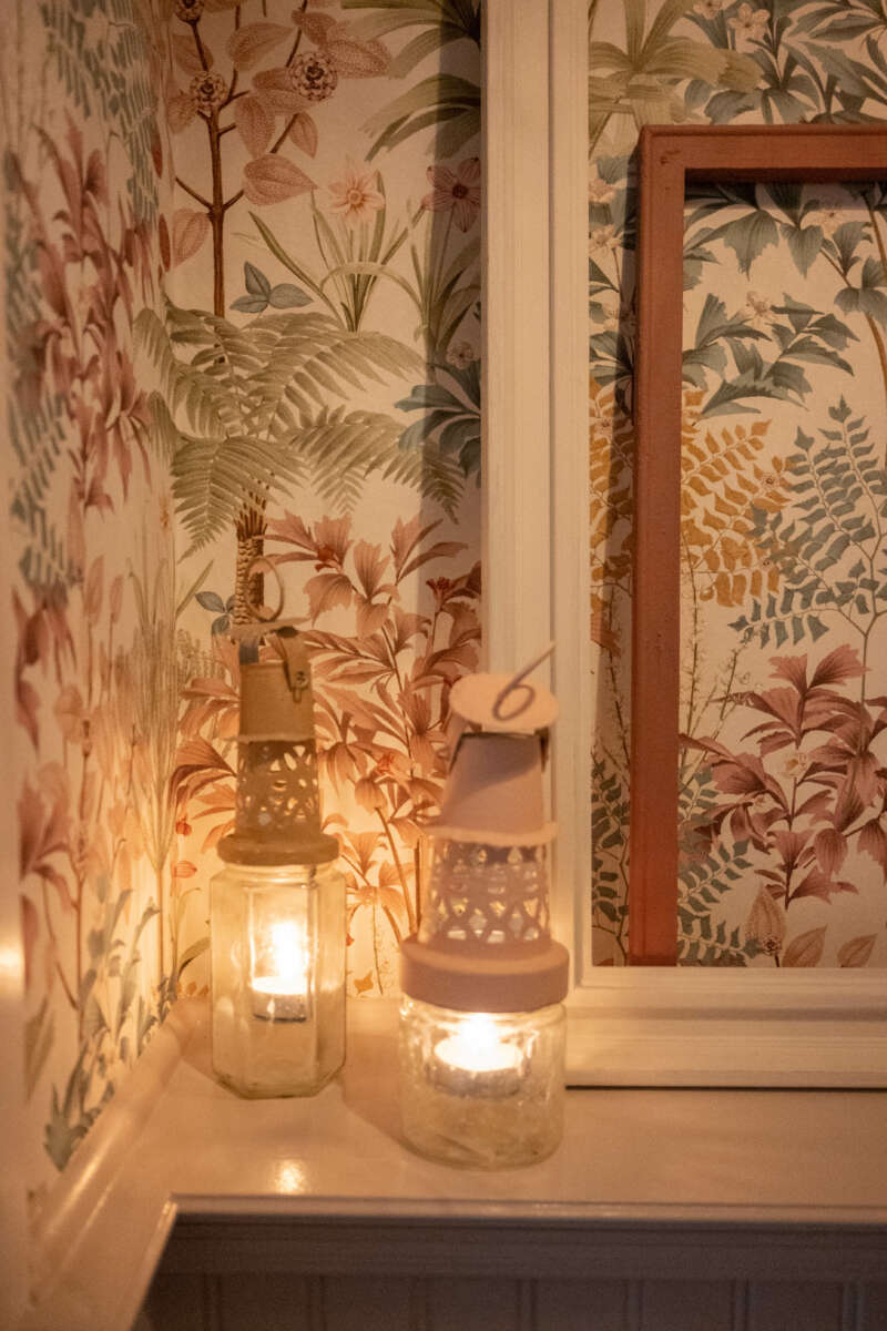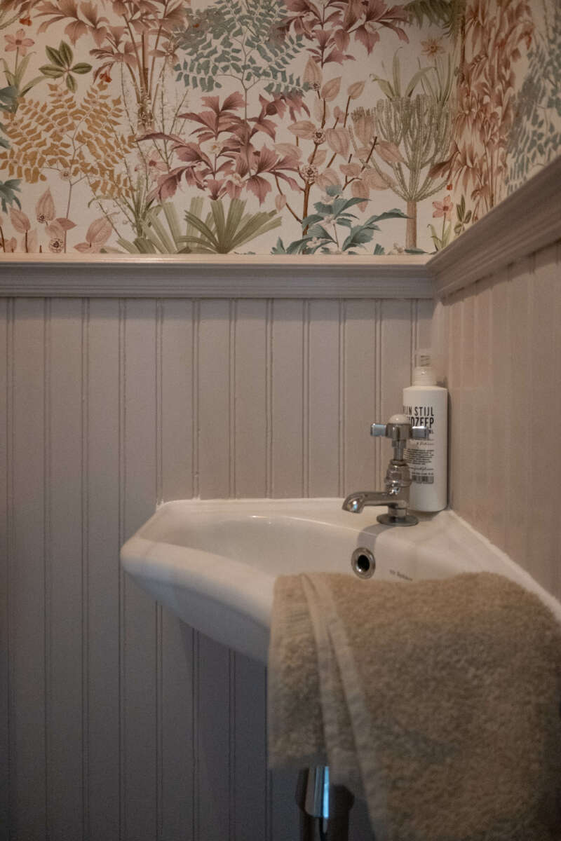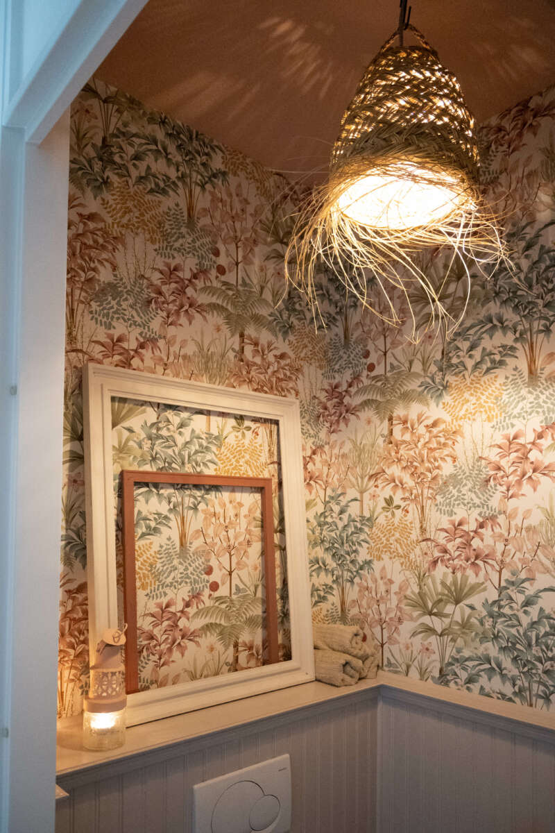 We hebben behang uitgekozen van Graham & Brown. Een prachtig botanisch behang wat alle kleuren van het huis in zich heeft. En dit zorgt dan automatisch voor de eenheid hier in huis. En dat vind ik wel fijn. Pietje precies die ik ben. Het was wel even een klusje dat behangen. Het is een kleine ruimte. Je denkt dat dit makkelijk gaat maar het is door de krapte en de hoeken best lastig.