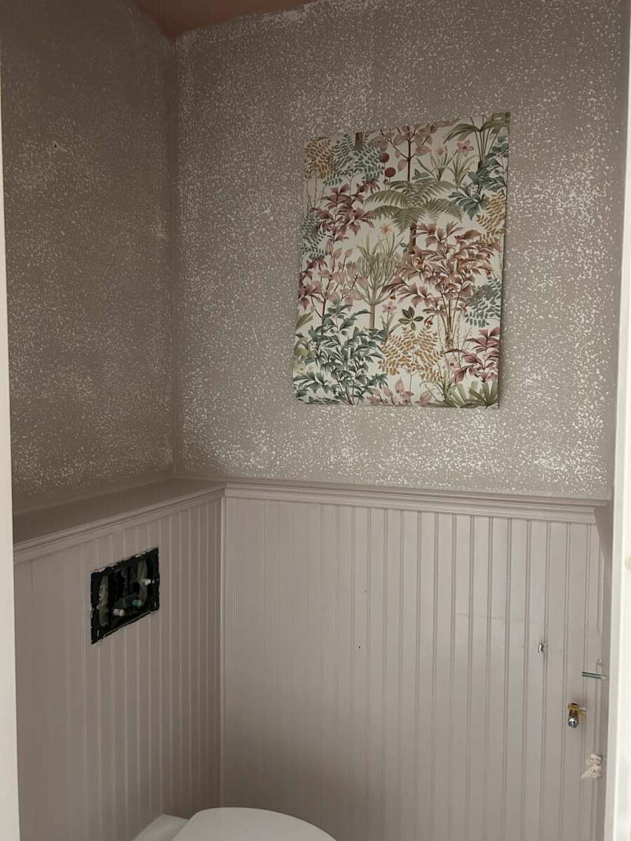 Behang was voorheen niet mogelijk in ons toilet omdat de muren grof gestuct zijn. Net zoals in de rest van het huis wat het soms wel eens lastig maakt om voor bepaalde kleuren of materialen te kiezen. We hebben hier de boel glad geschuurd. Nu is er eindelijk de mogelijkheid om hier een behangetje te doen. Supertof!